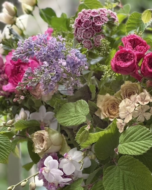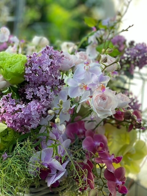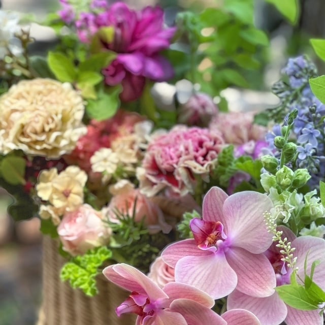 旬の枝花とバラや草花、蘭など多品種が調和したブーケ