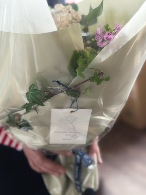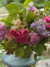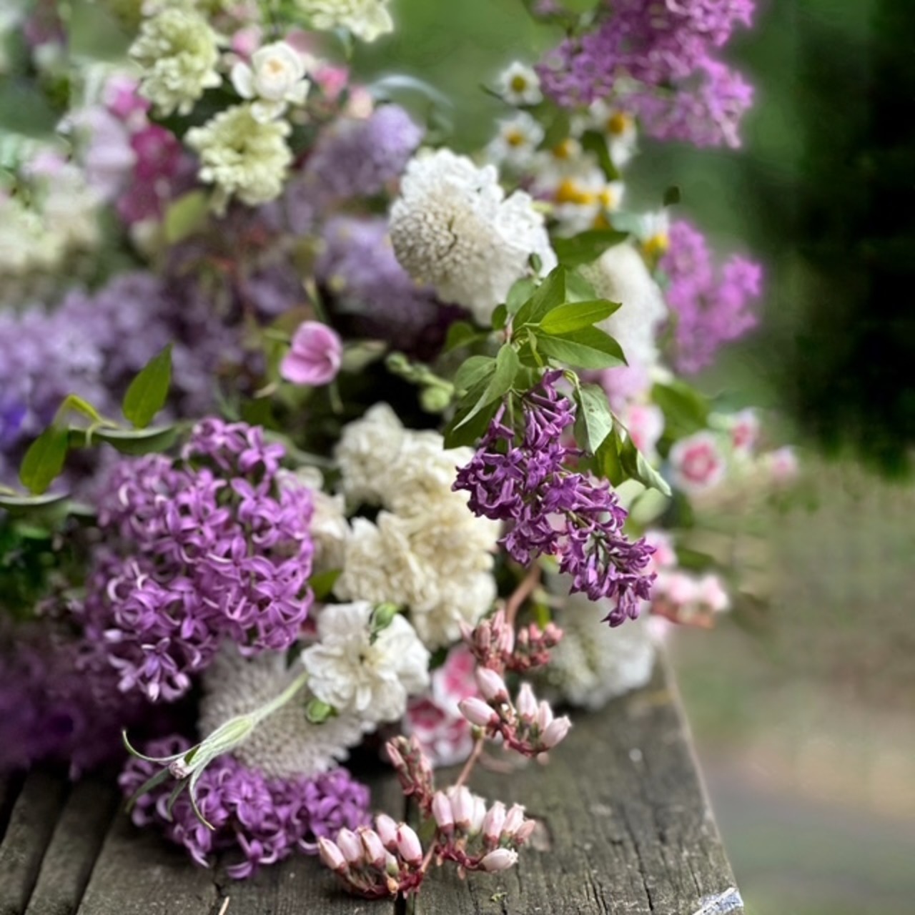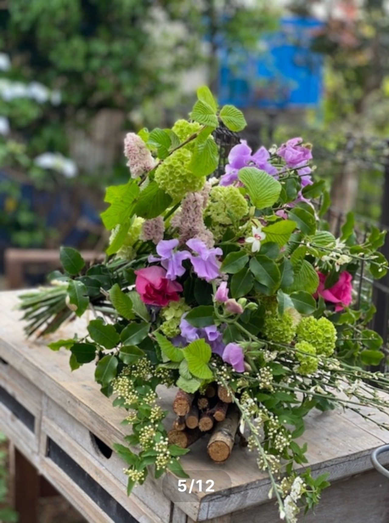 植物を長いままに大きく丸く束ねたグランブーケは、ラッピングを解くだけでそのまま花瓶に飾っていただいても、ブーケをくずし花遊びをしていただいても、お花好きのお母様にお楽しみいただける多品種を用いたアソートのお作り。両手で抱える大きなブーケを手にしていただいた瞬間の笑顔と感動をイメージして、たっぷりの旬の植物を集めてお作りいたします。葉っぱの使い方とラッピングのアクセントにプラスするボタニカルパターンのペーパーが、アンティークの世界観を広げます。