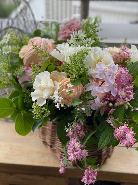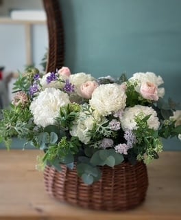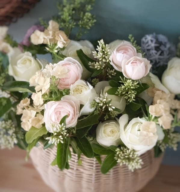 スタンダードなバスケットを用いながらも、植物をより豊かに用いるアレンジメント。重ねるクラシカルな表情のバラは、アンティークの世界観を醸します。