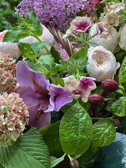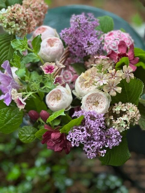 旬の枝花とアンティーク調のバラや草花によるアレンジメント